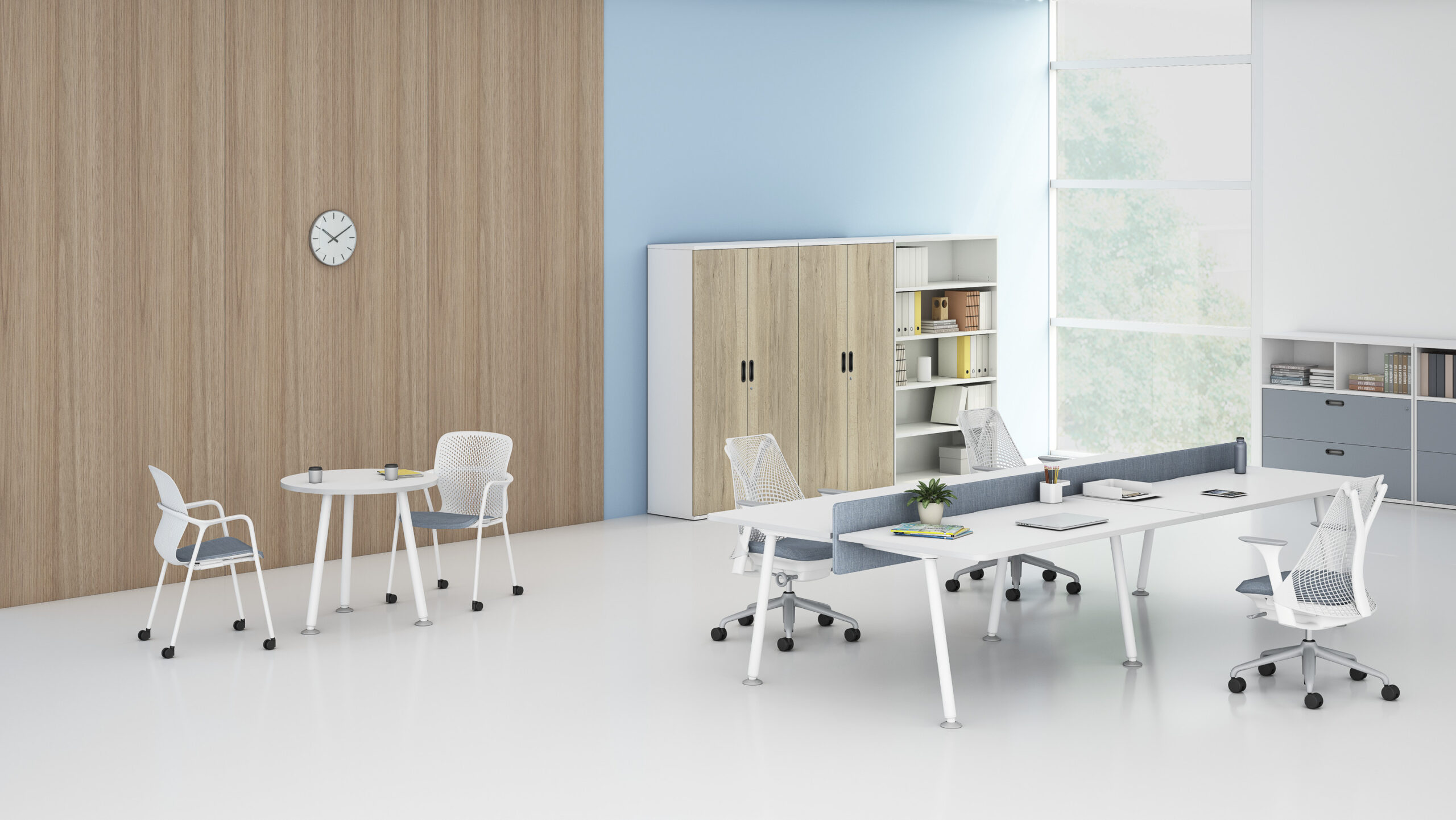 At Herman Miller, we have been considering the connection between storage and the way people work for over 80 years. The thinking and designs of Gilbert Rohde, George Nelson and Robert Propst are the foundation for our human-centred approach to storage design. Paragraph is a storage system designed to be both relevant and productive within the modern workplace. It goes beyond the traditional function of housing the output of work, such as files and folders; it is flexible, architectural and personal. As individuals become increasingly mobile, and digital or cloud-based storage has become the norm, the use of physical storage within the workplace has evolved. People need to store personal items, shoes, cycle helmets, gym kits and snacks alongside their papers and files. Paragraph embraces this change by offering a storage solution which caters to both these needs, using traditional cupboards and drawers alongside open shelves and lockers. Paragraph was designed to be applied in a variety of ways from personal storage or team filing through to space division or archive, reflecting the varied landscapes in the office today. The choice of heights, widths and finishes will readily complement existing furniture. Paragraph brings a new level of precision to MFC storage, which is manufactured and assembled in our own factory. Through rigorous design and engineering processes we ensure that Paragraph delivers the quality you expect. And like our other products, it’s the details and choices that matter – from the range of closure types (hinged, tambour or sliding) to handles (surface or flush-mounted).